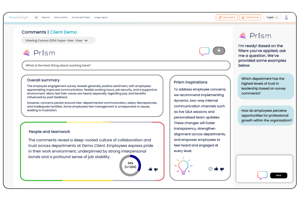 Powered by secure, ethical next-gen AI, Prism analyses thousands of survey comments, uncovering meaning, tone, and underlying sentiment.